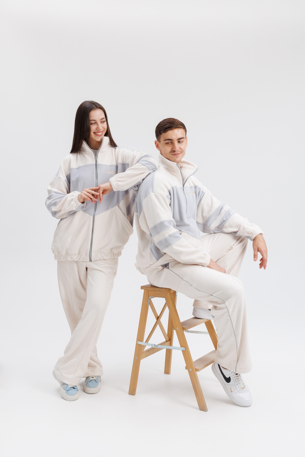 Костюм включает куртку на молнии с удобными карманами и брюки с эластичным поясом — комфорт в каждой детали.